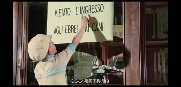 这不是我要讲的重点,重点是在他有孩子之后,德国人来了,犹太人被歧视,他告诉儿子,犹太人与狗不得入内,只是一个普通的限制,就像有些地方不允许西班牙人去一样。