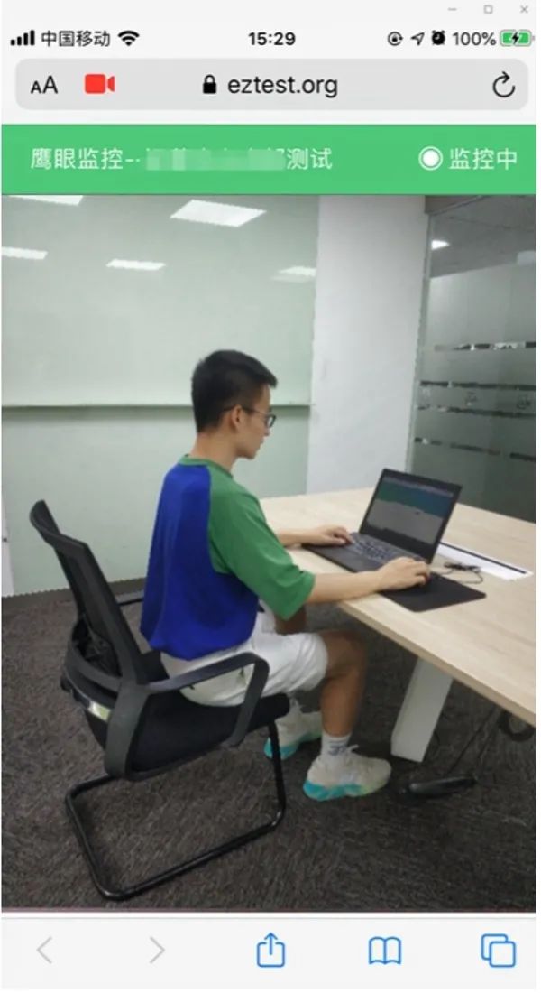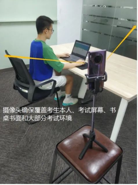 第二视角鹰眼监控设备架设好以后,可以使用前置摄像头的拍照功能,查看监控效果、调试监控角度。确认监控摄像头正常工作无遮挡,监控范围覆盖考生上半身(双手可见)、完整的考试设备、答题设备的屏幕、以及考生周边环境。保证考试区域光线均匀充足,避免监控画面过暗或过亮,导致监控效果不佳被判定为违纪。