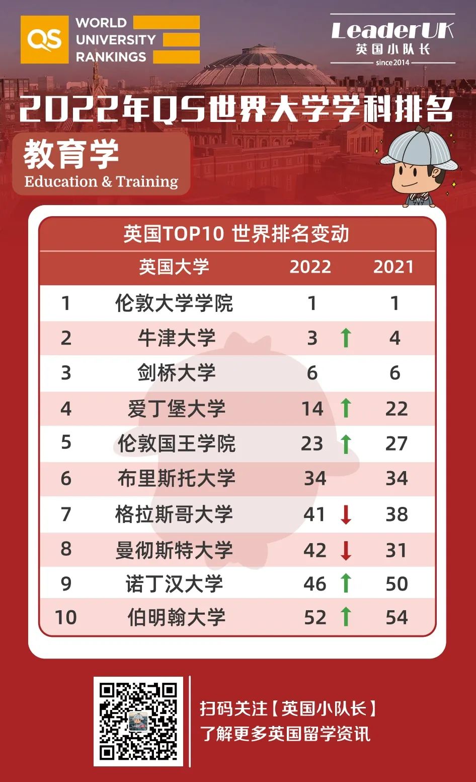 教育学排名中,英国前十的大学和去年一样,名次虽然有些变动,但是整体情况没有太大改变。 曼彻斯特大学 :世界排名跌了11名,英国排名跌了2名。社会学排名中,英国前十的大学在世界排名上整体提升不少,不过在英国的名次还和去年一样。值得一提的是,LSE和牛津大学虽然在社会学排名中保持和去年一样的位置,但在社科领域的综排中,位置却对调了。LSE今年排名世界TOP3,跌了1名;牛津大学则登上世界TOP2,升了1名。传媒学的排名中,英国前十大学相较去年而言,整体表现没有太大变化,除了一所大学跌出前十。跌出英国前十的是威斯敏斯特大学,从去年的世界TOP50降至TOP51-100,位列英国TOP14。取而代之的是爱丁堡大学,英国排名上升3名,冲进英国前十!
