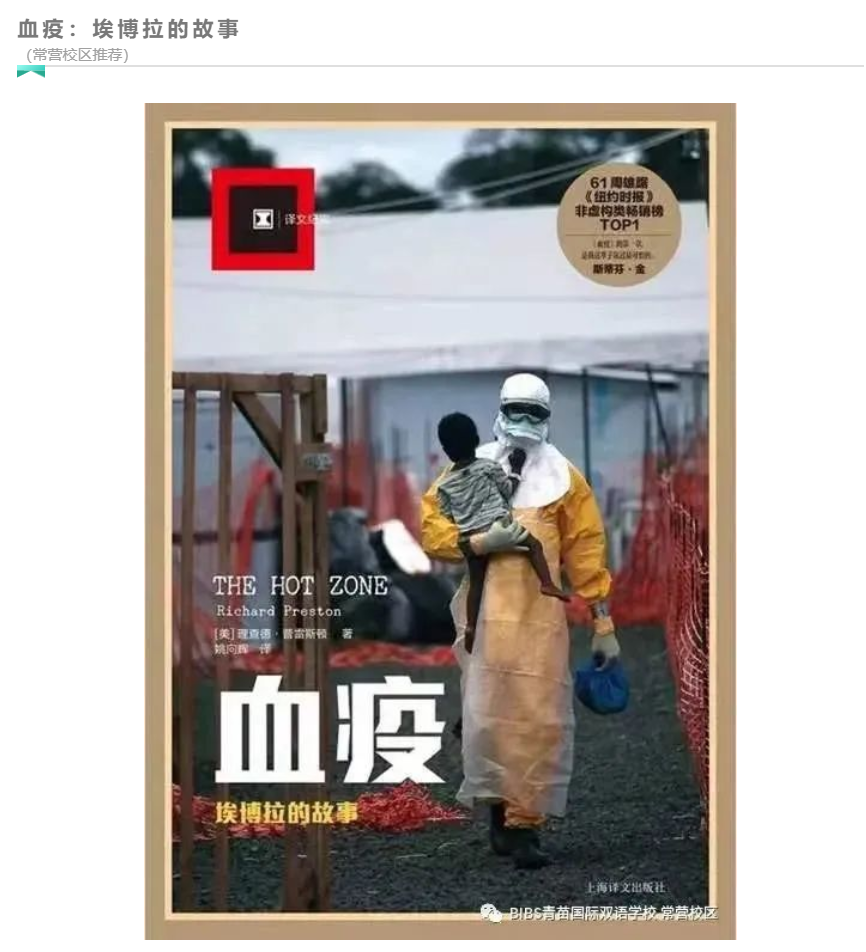 《血疫:埃博拉的故事》、《追风筝的人》、《My Side of the Mountain》、《Call of the Wild》、《To Kill a Mockingbird》、《人类的群星闪耀时》、《上下五千年》、《科学的旅程》、《居里夫人传》……这些书目出现在了青苗国际双语学校、上海美高双语学校、成都树德中学国际部等国际学校的推荐书单中。