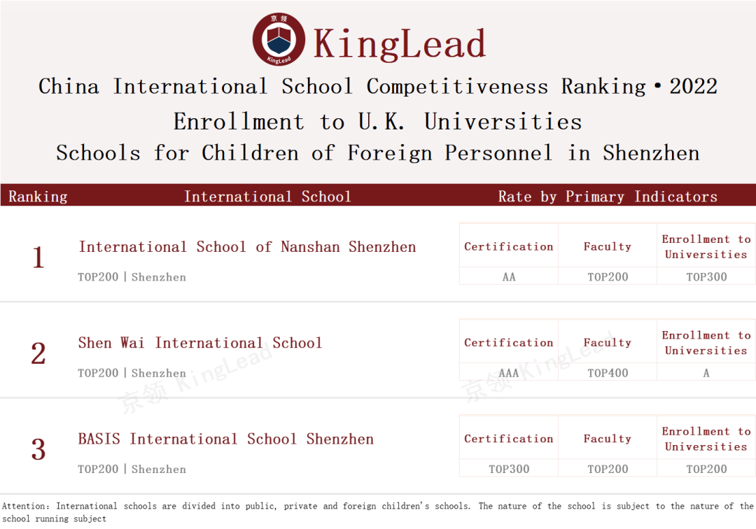 In the direction of Enrollment to U.K. Universities, the foreign children's schools in Shenzhen are International School of Nanshan Shenzhen, Shen Wai International School and BASIS International School Shenzhen.