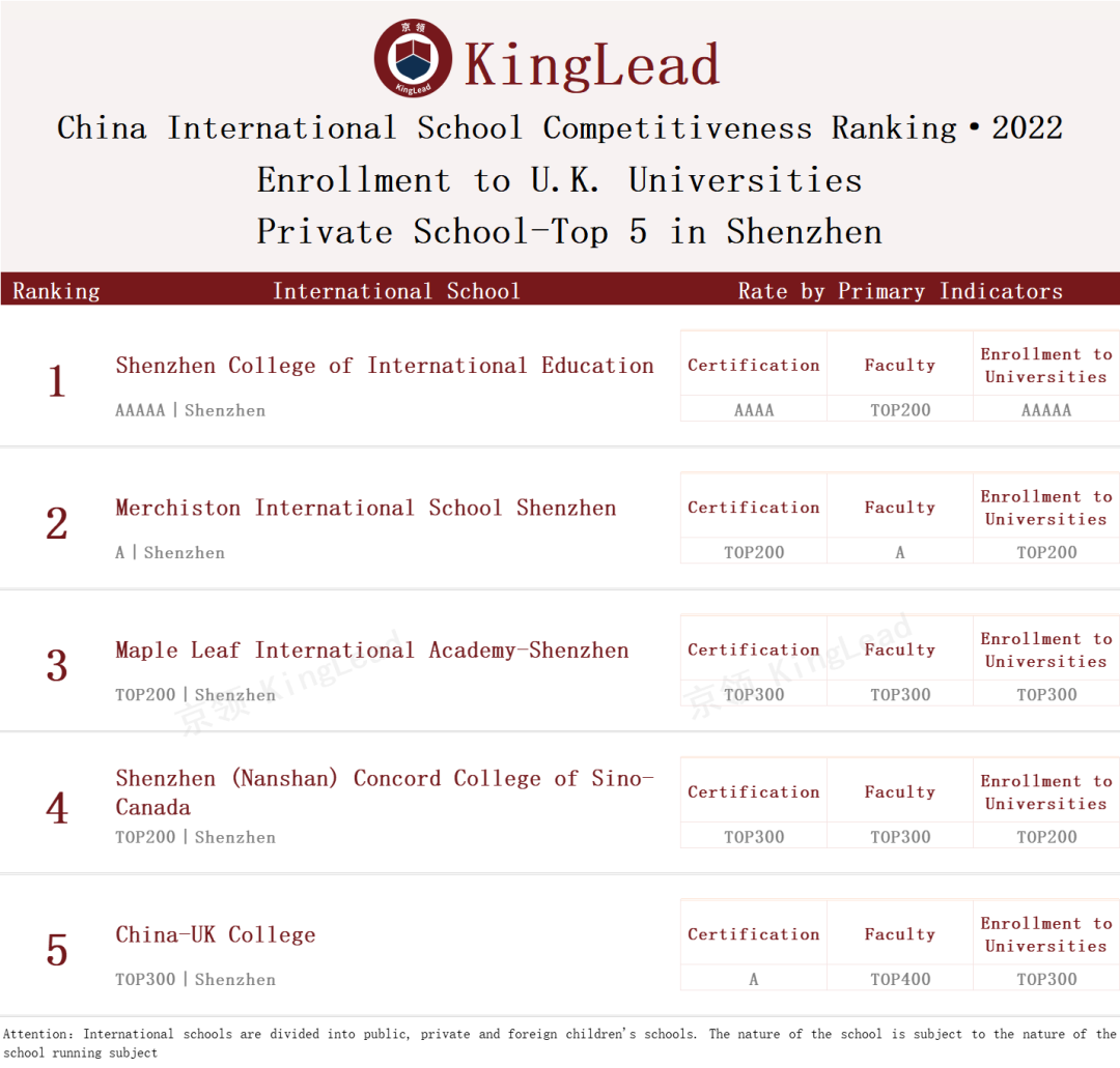 In the direction of Enrollment to U.K. Universities, the top five private schools in Shenzhen are Shenzhen College of International Education, Merchiston International School Shenzhen, Maple Leaf International Academy-Shenzhen, Shenzhen (Nanshan) Concord College of Sino-Canada and China-UK College.