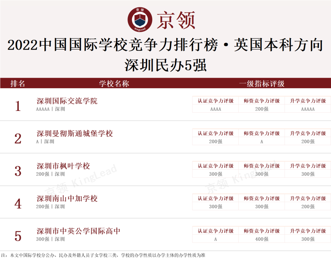 英国本科方向上,深圳民办学校五强分别为深圳国际交流学院、深圳曼彻斯通城堡学校、深圳市枫叶学校、深圳南山中加学校和深圳市中英公学国际高中。