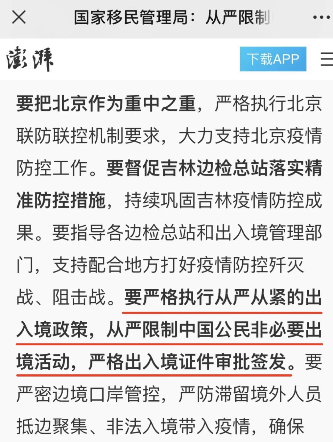 @澎湃新闻发布国家移民管理局消息,严格执行从严从紧的出入境政策,从严限制中国公民非必要出境活动,严格出入境证件审批签发。