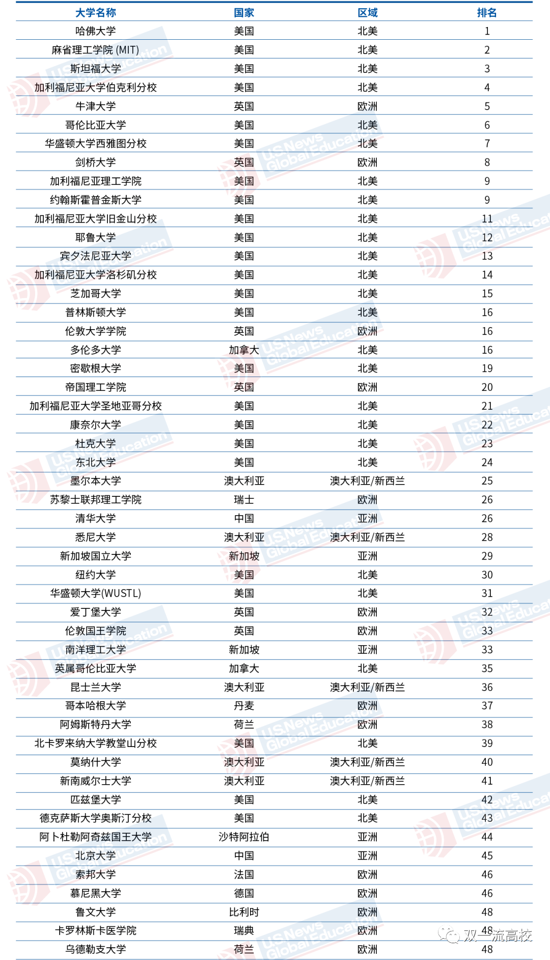 2022英国泰晤士报高等教育副刊世界大学排名top50