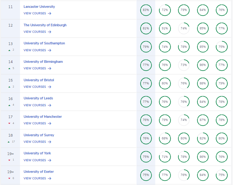 ·南安普顿大学排名13, 比去年上升2位;伯明翰大学排名14,上升5位;布里斯托大学排名15,上升2位;利兹大学排名16,比去年上升4位;