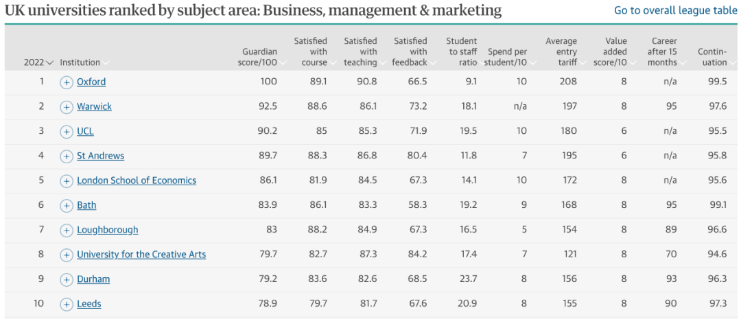 需要注意的是,《卫报》只对英国高校的本科专业进行了排名,而专业不同于具体课程,同一类型专业下可能会有好多相关课程。此外,如果一个学校某专业的学生人数过少,也不会计入排名。