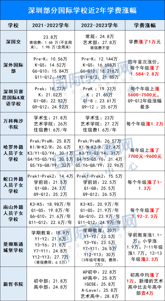 几所纯外籍学校中,南山国际和曼校均最高涨2.3万,涨幅达到10%左右。