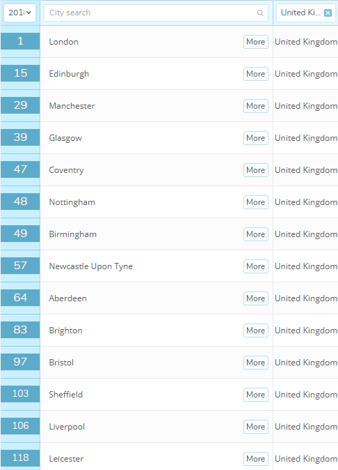 此次英国共有14个城市入榜,其中伦敦连续第二年排名全球第一。