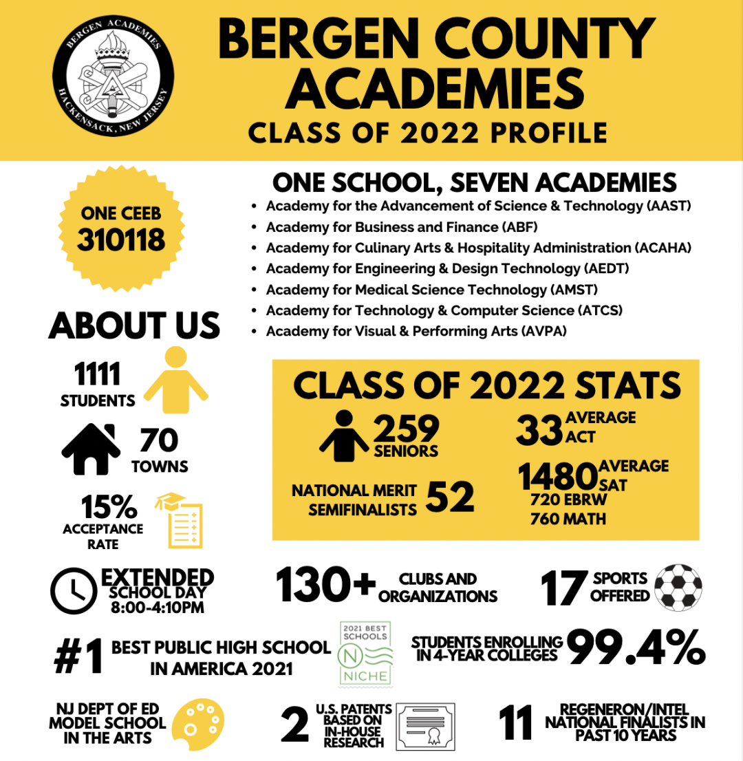 拿美国Bergen County Academies举个例子,这是一所新泽西州的顶尖公立学校。学校档案第一页的信息一目了然: