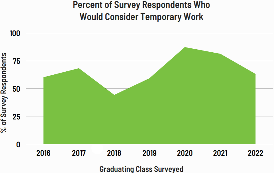 仅有63%的受访者称自己考虑接受临时工作,该比例为近年最低。其原因可能在于供不应求的劳动力市场,2022届毕业生拥有了比上两届学生更多的选择。