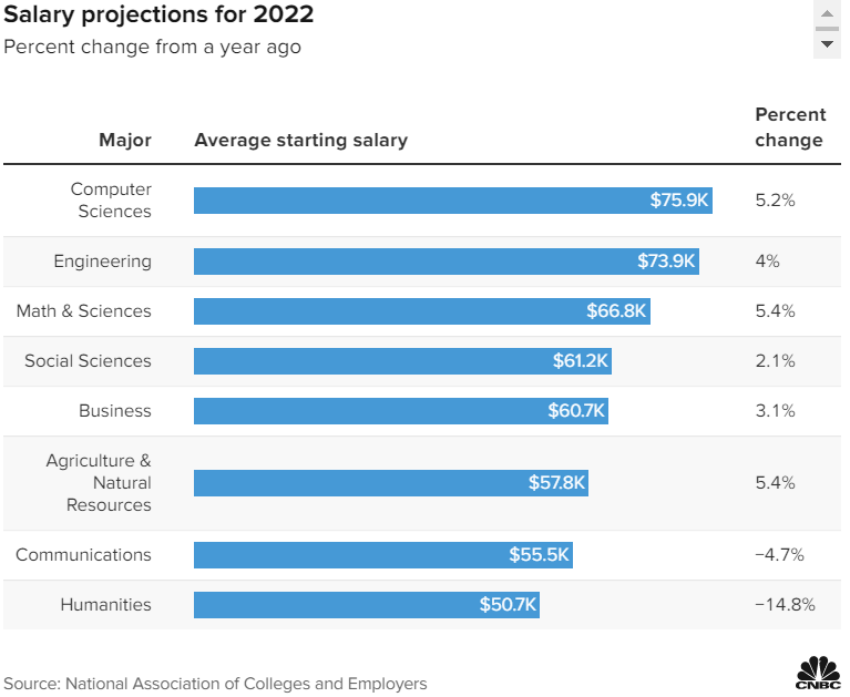 某些特定学位(尤其是工程领域)的持有人起薪尤其可观。2019年7月至2022年七月期间,Payscale在全美范围内对25万余名持有且仅有学士学位的全职员工进行在线薪资调查,结果显示本科毕业生起薪中位数最高的十大专业(以及相应专业毕业生起薪中位数最高的高校)如下: