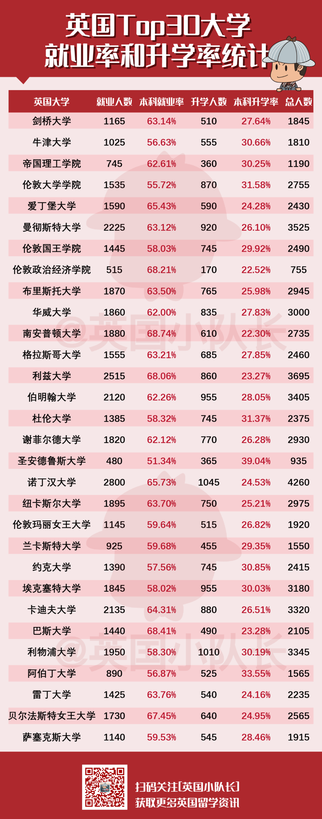 在英国大学就读本科的大家,毕业后一般有两种选择:就业或升学。英国高等教育统计局(HESA)最近发布了一组全新英国大学就业数据,其中就包含了英国各个院校都有多少学生选择就业、多少决定继续升学。