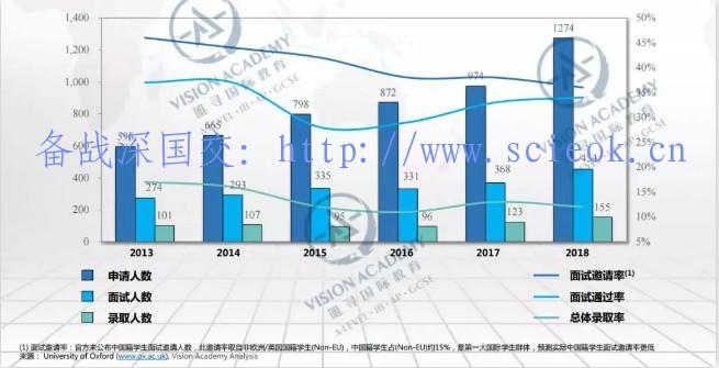 从此柱形图表中我们可以看到:报考牛津的中国申请者数略上升趋势明显,6年复合增长率为13.5%。近 四年录取率在12%上下小幅波动,面试邀请率进一步降至36%,而通过率则小幅增加了1个百分点。 数据包括所有中国籍的申请者(不包括香港与台湾)。