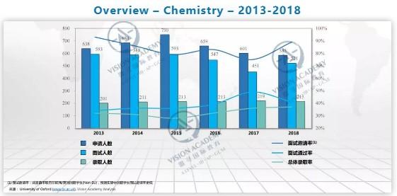 从此柱形图表中我们可以看到:化学系的申请人数已连续三年下滑;平均面试邀请率高达84%;虽然申请数 量减少,但是该专业的录取人数却保持稳定,因此录取率仍保持着缓升趋势。