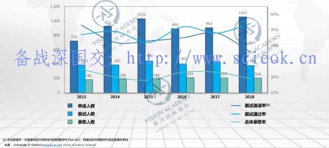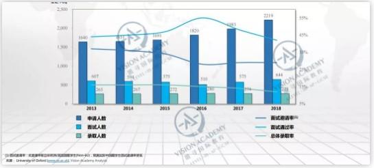 从此柱形图表中我们可以看到:牛津申请人数逐年上升,现已突破21000人,6年复合增长率3.8%,而录取率在最近一年下降至18%。面试邀请率6年来降低了11个百分点,18年数据为 46%,面试通过率则总体保持稳定。