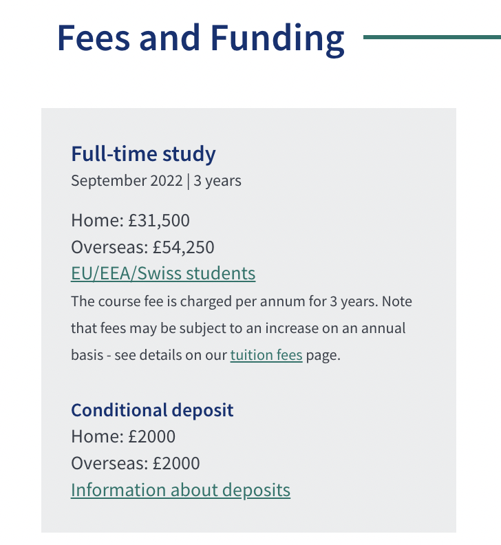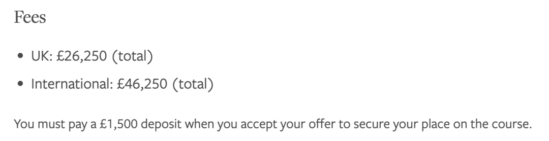 医学院大多数专业学费为35,600英镑,商学院大多数专业学费为29,500-35,900英镑,最贵的MBA学费为57,200英镑。