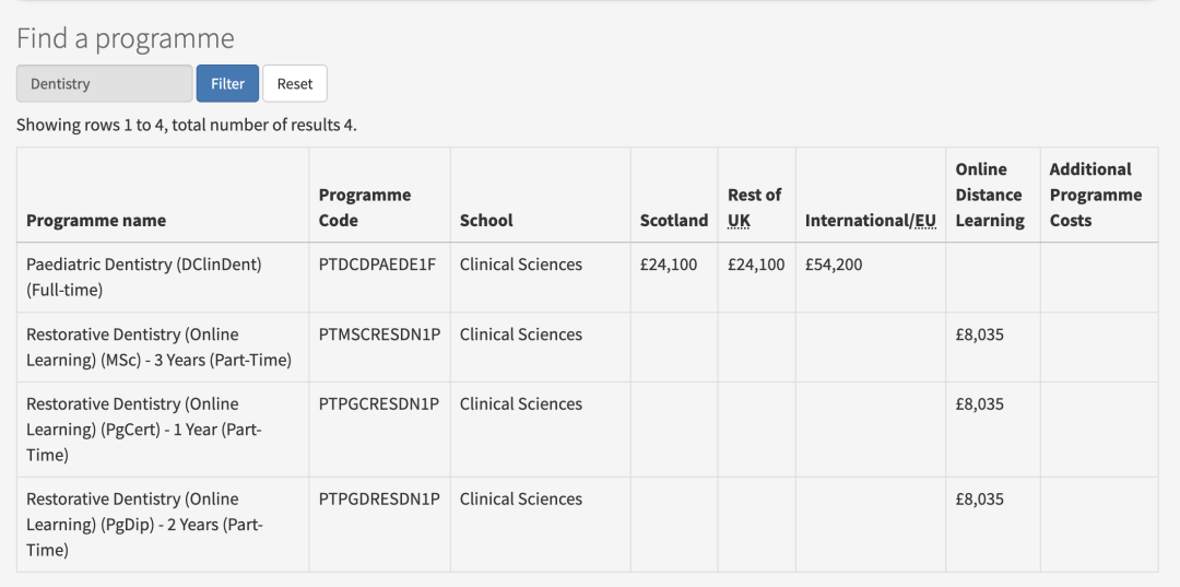 牙科类专业最贵,如儿童临床牙科、牙髓学临床,学费为47,000英镑。
