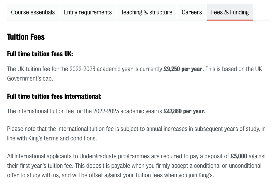 伦敦大学国王学院本科学费较低的是一些人文类专业,每年学费为20,970英镑。