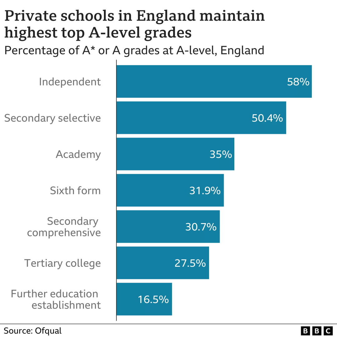 Ofqual数据显示,58%的私立学校A-levels考生获得了高分(A*和A),而公立学校考生高分比例仅为30.7%。