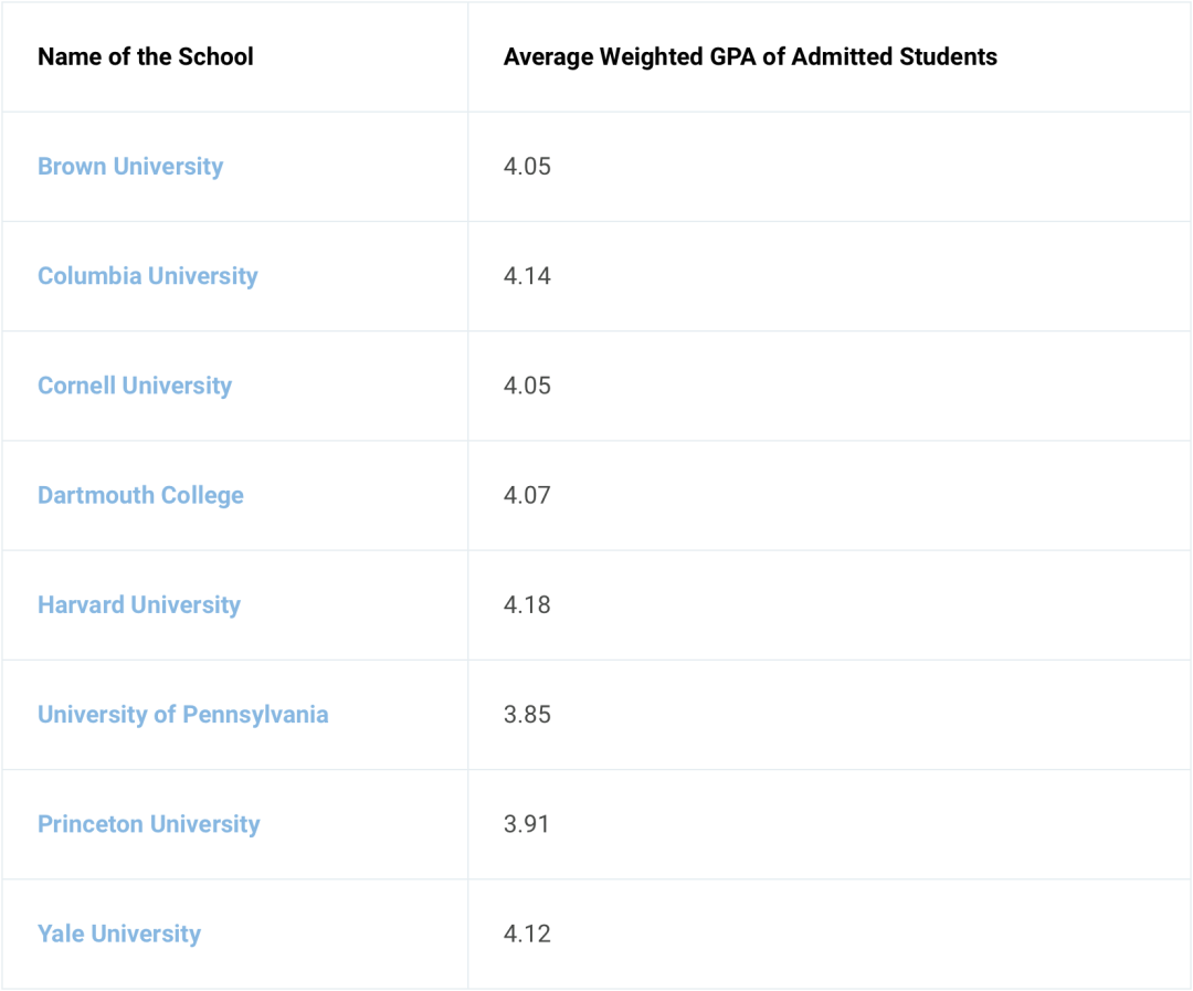 如果你想知道录取者的平均GPA,大学每年公布的Common Data Set是一个很好的信息来源。我们在这里贴出了今年藤校录取者的平均GPA和录取率,大家可以对照着自己的GPA来比对一下。