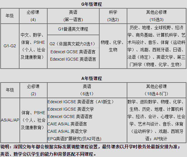 深国交开设了IGCSE、A-Level和AP课程,兼顾英美体系。共开设了43门课程,涵盖科学、语言、人文、数学、经济与商学、艺术与设计、计算机科学、音乐等门类。