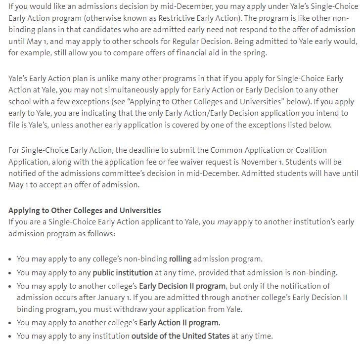 耶鲁大学的SCEA申请于11月1日截止,并于12月中旬发放录取结果。与其他不具约束力的早申一样,被录取的申请人在次年5月1日才需要决定是否正式入读,且可以申请其他大学的RD。