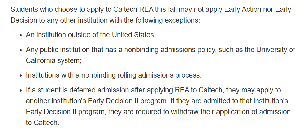 ○ 如果学生在向加州理工学院申请REA后被延期至RD,他可以申请另一所学校的ED2。如果他被该校的ED2录取,就必须撤回加州理工学院的入学申请。