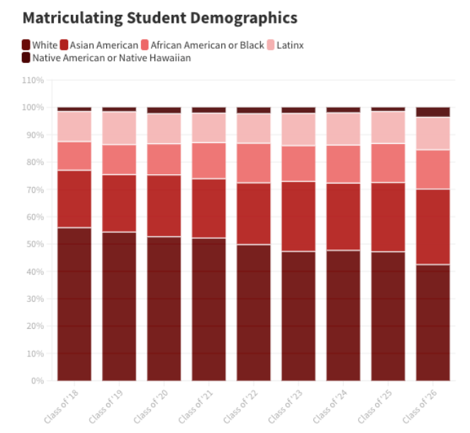 从性别和种族比例上来看,男生44%,女生43%,男生略有优势,还有13%的新生不愿意公布性别或选择其他性别。在美国本土新生中,亚裔占到了40%,其次才是白人37%,西班牙/拉丁裔14%,非裔13%。