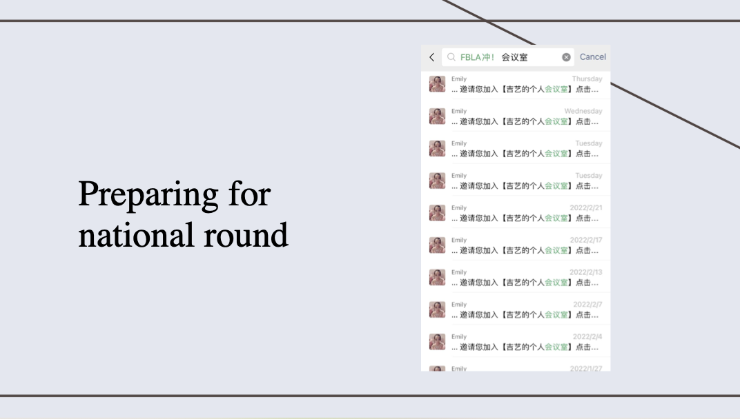 金秋时节,来自A1年级的四位学长学姐于放学后开办了一场分享会。会上给同学们介绍了不同的商赛形式,讲述了他们参加各大商赛如FBLA、MEC的经历,着重分享了参赛过程中那些或失败或成功的尝试。这些宝贵经验不仅是接下来进行初试商赛的学生们的避坑指南,也是指路明灯,小试牛刀的敲门砖!