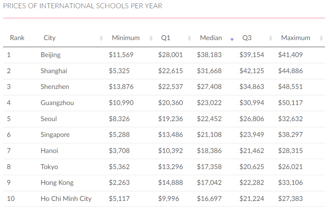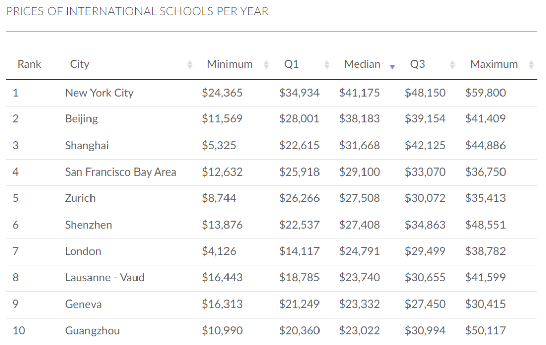 在International Schools Database统计数据中[3],截止到2021年,在国际教育支出方面,北京因其中位数(图中Median一列)最高而排在首位,意味着北京在国际教育支出方面的中间水平最高。