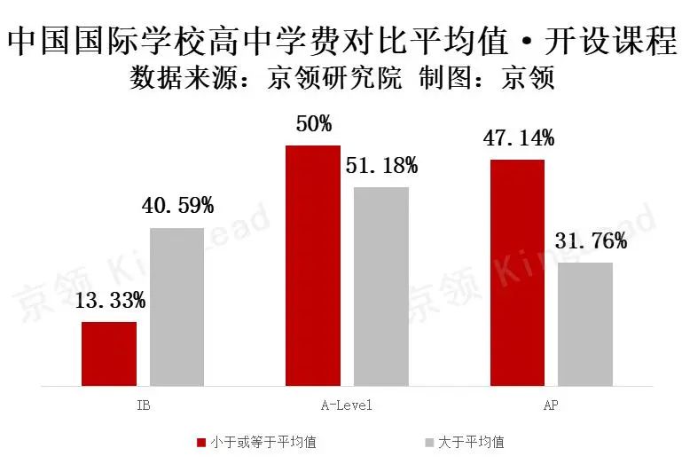 而在高中学费标准大于全国平均值的中国国际学校中,开设有A-Level课程的学校数量占比约51.18%;开设有IB课程的学校数量占比约40.59%;开设有AP课程的学校数量占比约31.76%。