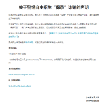 目前,已经有高校注意到了“保录取”诈骗。2021年8月,宁波诺丁汉大学就发布过一则关于警惕自主招生“保录取”诈骗的声明。学校表示,曾收到举报,有不法分子声称可以无视成绩“保录取”宁波诺丁汉大学自主招生,借机骗取学生及家长钱财。声明里,校方提醒学生家长们注意甄别:“我校从未以授权或其他形式与任何社会培训机构或个人开展关于自主招生的‘保录项目’。”