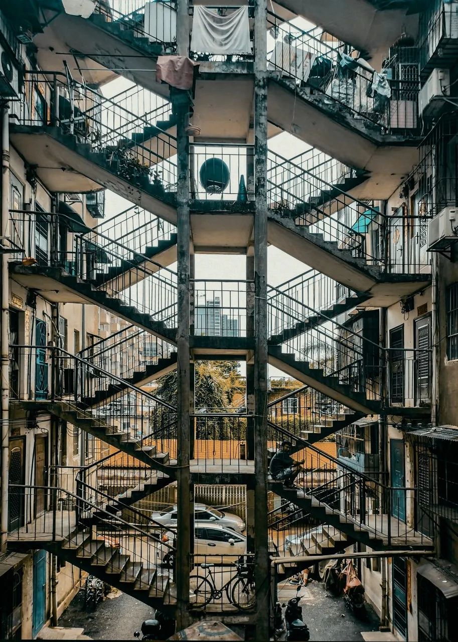 两栋居民楼靠楼梯交织相连,宛如一张立体的密网,阳光只能透过“密网”倾洒在地上,形成的阴影也与其呼应。