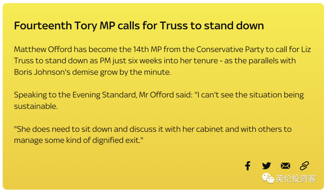 截至发文(英国时间10月20日午间),目前已有14名保守党议员公开要求特拉斯下台。