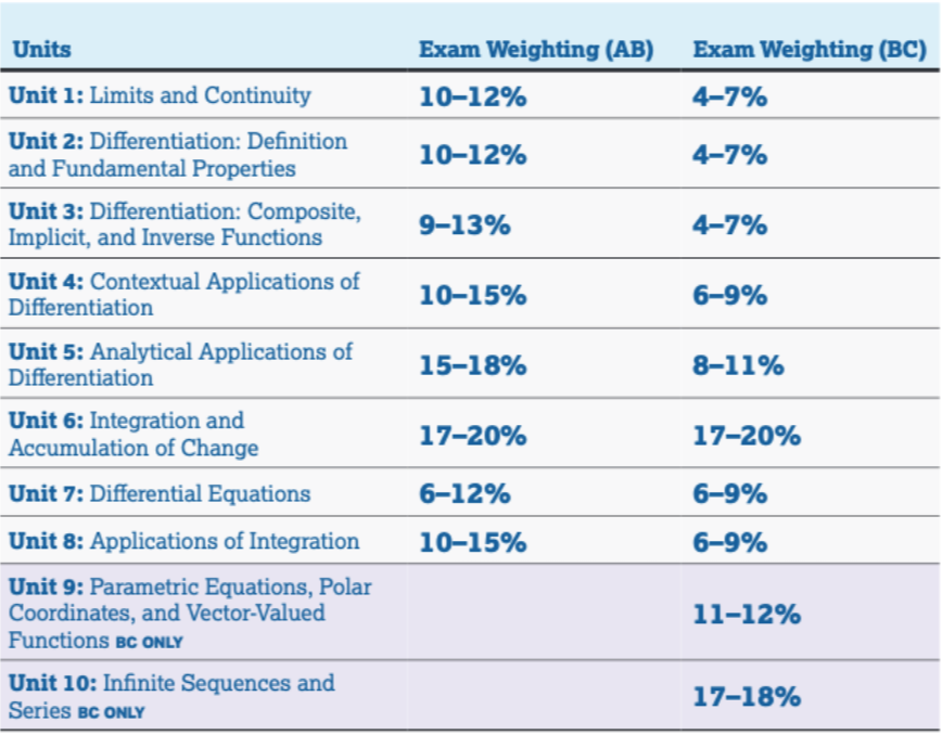 AP微积分课程包括微积分AB(Calculus AB)和微积分BC(Calculus BC) 两门课。其中微积分AB相当于大学微积分第一学期课程,重点讨论微分(differential)和积分(integral)的基本定义及简单应用,包括求弧长,曲线围成的面积,以及解决物理学中的运动问题。微积分BC则相当于大学微积分第一和第二学期课程,是将微积分AB中学到的内容和技巧应用于参数定义曲线 (parametrically defined curves),极坐标曲线(polar curves),向量函数 (vector-valued functions)中,另外加入了无穷级数(infinite series)的内容,应用无穷级数来近似处理函数以描述整个函数的变化。
