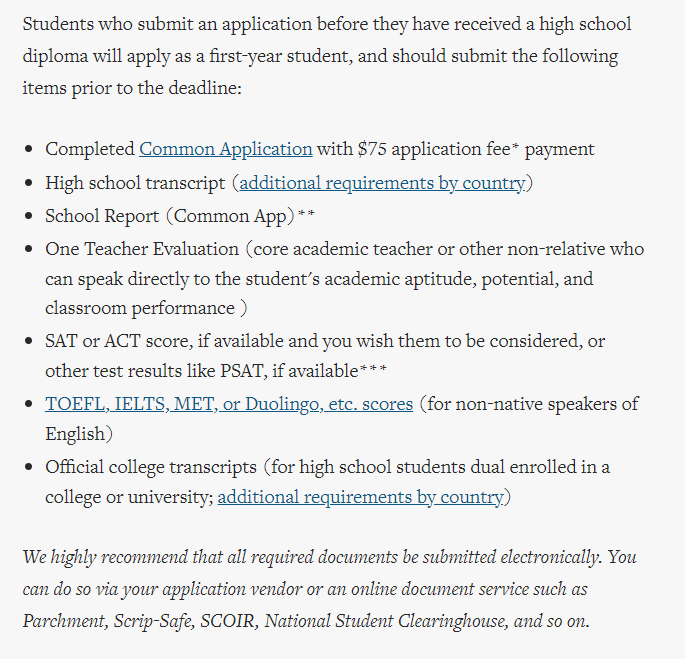 杜克大学官网截图:ED申请于2022年11月1日截止,必须提交申请表、高中成绩单、高中报告+升学顾问推荐信、教师推荐信、SAT/ACT成绩等申请材料,但接受的最晚SAT/ACT考试日期是2022年11月6日。RD申请于2023年1月3日截止,但接受的最晚SAT/ACT考试日期是2023年1月31日。