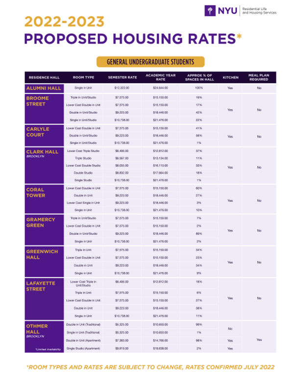 美国本科通常是四年制,有的学校要求学生第一年住宿在学校,而之后学生就可以选择住校或者自己租房居住。- 纽约大学位于纽约市中,学生的住宿费用会随着地区的不同费用也会不同,纽约作为美国消费水平比较高的城市,他的住宿费相对较高,NYU给出的预估平
