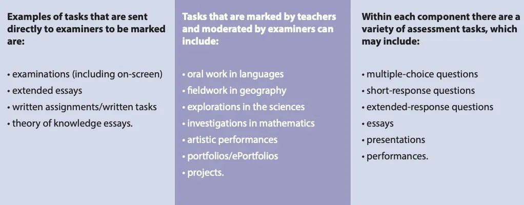 其中,内部评估大约占最终成绩的20%,形式和占比根据具体的科目而不同,该评分由本校老师进行评定,IB也会从学校抽取样本核对分数。外部评估大约占最终成绩的80%,以试卷的形式根据课程难度等级出题,时间为每年5月(北半球)。