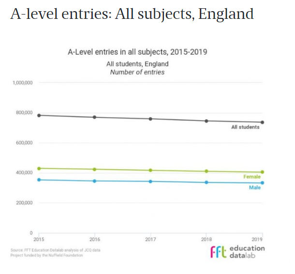 下面的数据出自Schools Week公布的Education Datalab英国学生各科目A-level成绩统计→→