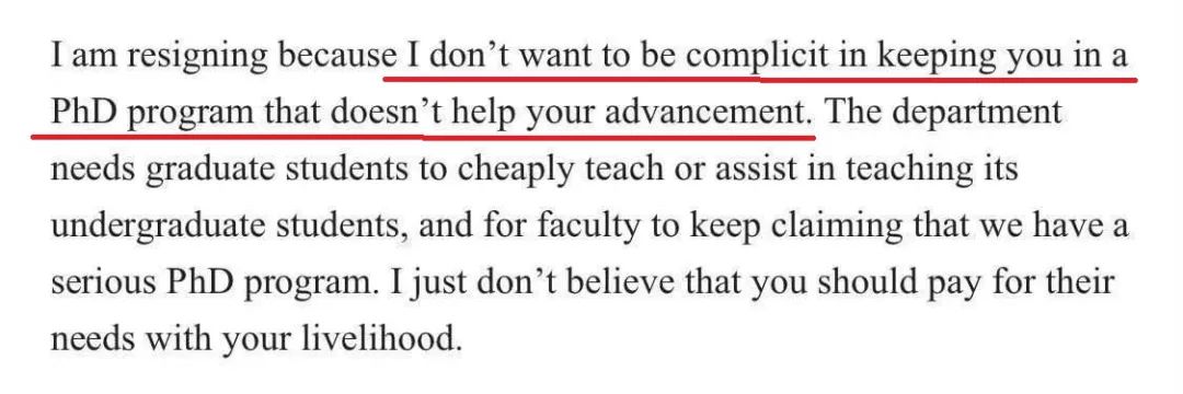 他指出学院需要博士生来充当廉价教授、辅导本科生的角色,一直以来对外声称这是一个正经的博士课程,赚取大家的学费。