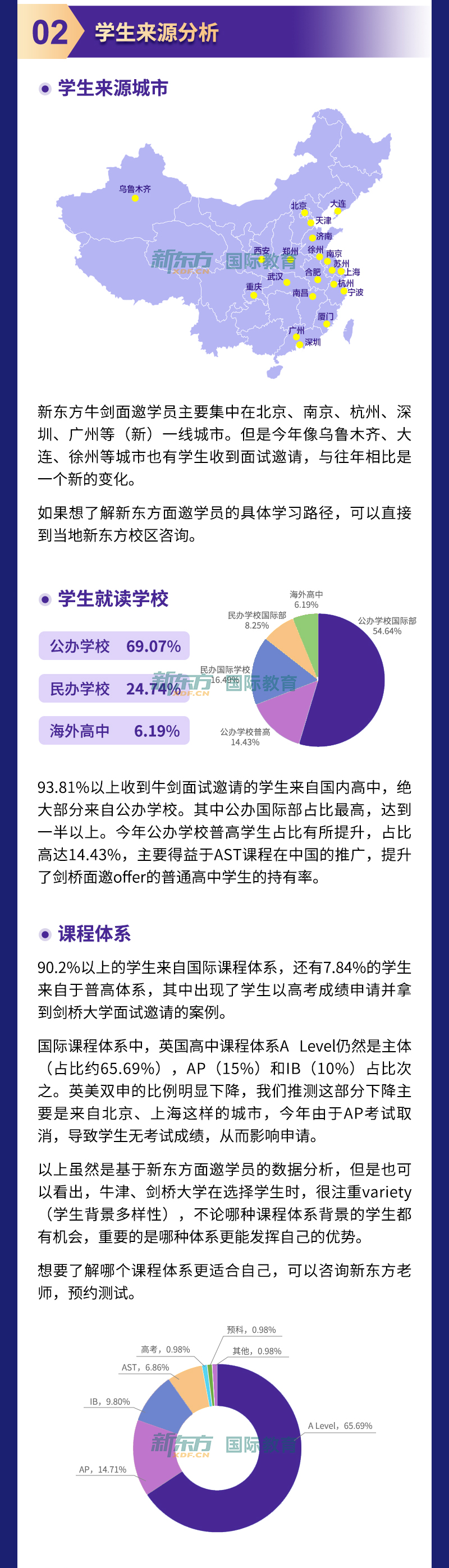 2023申请季,65.2%的学生拿到的是剑桥大学的面邀27.5%的学生拿到的是牛津大学的面邀。这和牛津大学严笔试宽面试,更重视学生笔试成绩,剑桥大学宽笔试严面试,更重视学生的面试表现有很大关系。由于按照申请规则牛津剑桥大学只能申请其中1所学校,在选择同类专业的前提下,擅长笔试的学生投递牛津大学更有优势,擅长面试考试的学生申请剑桥大学则胜算更大。