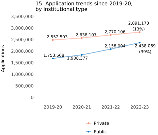 4、相比疫情前的(2019-20)年,三年间公立大学申请的增长幅度(39%)远高于私立大学(13%)。