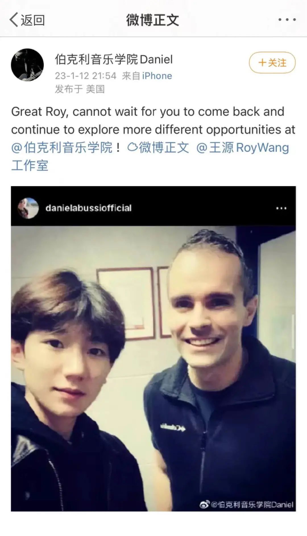 1月12日,伯克利音乐学院负责招生工作的Daniel,发微博表示欢迎王源即将返校。
