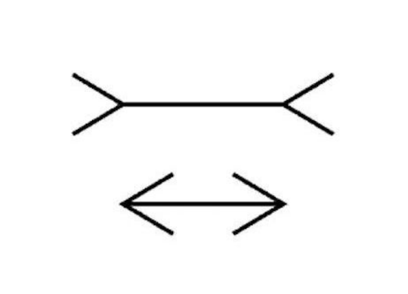 系统1和系统2有明确的分工。系统1自主运行,而系统2通常处于放松状态。当系统1运行遇到阻碍时,就会向系统2求助。这里还要说明,因为系统1无法关闭,所以产生了我们所谓的直觉和冲动,也就有了成见和错觉。 下图就展现了经典的缪勒-莱尔错觉: