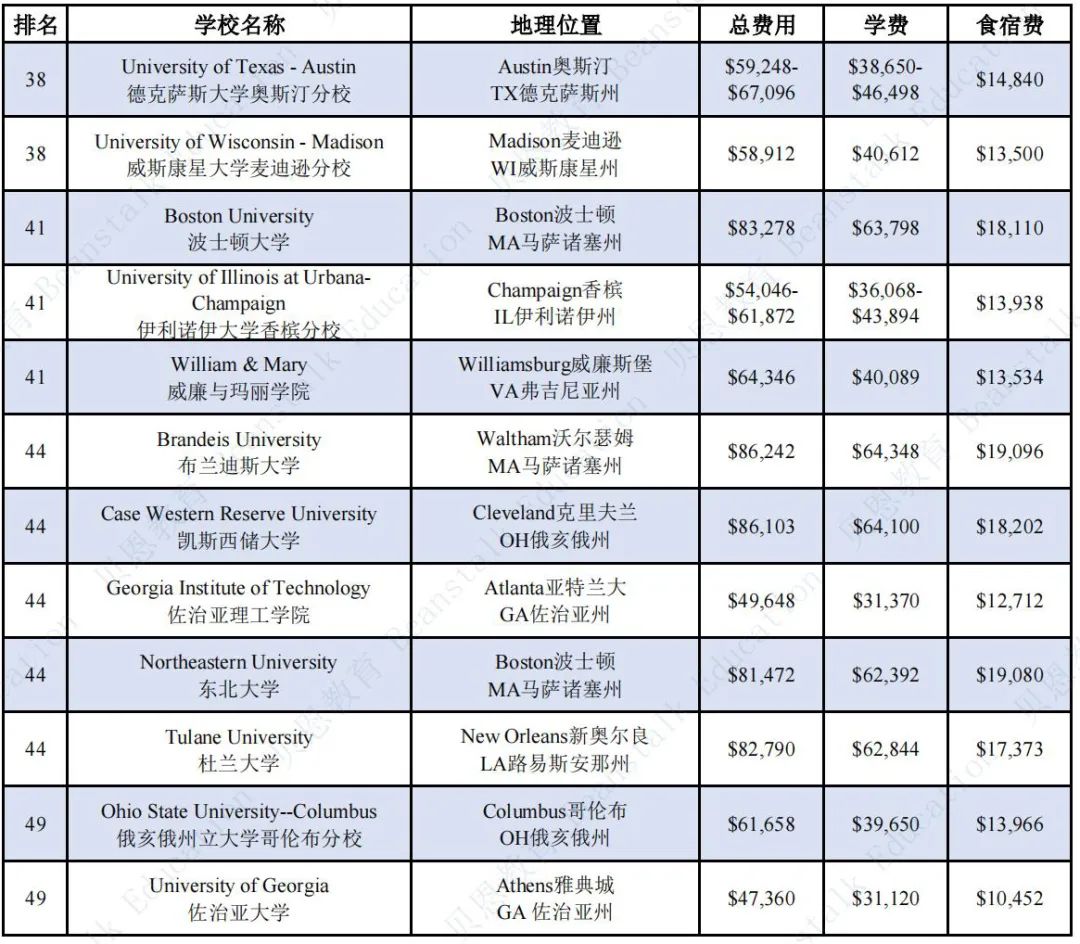 3. 总费用数据来源各大学官网,为参考费用,实际费用以学生的最终账单为准。