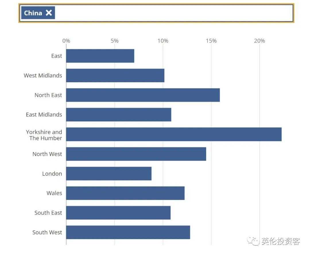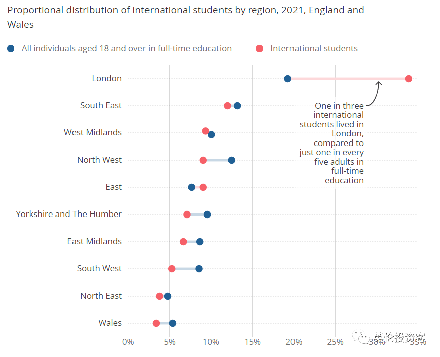 按照出生所属地来看的话,在英格兰和威尔士的留学生人口中,中东和亚洲出生的学生是最大的群体(40.2%)。按国家/地区细分的话,印度(11.6%)、中国(11.2%)、罗马尼亚(9.5%)和尼日利亚(5.3%)这四个国家在留学生总人口中占比最多。ONS还在图表中强调,如果与非英国出生的总体人口(也就是除了算上留学生,还算上其他国际移民)相比,中国留学生所占的比例最大,超过了印度。如下图所示,年龄方面,18至25岁的国际学生(212,000,56.7%)多于26岁及以上的学生(162,000,43.3%),可见更多的留学生选择在成人初期阶段留学。非欧盟留学生比欧盟留学生相比年龄偏大,非欧盟留学生的高峰年龄为22至23岁(18.9%),欧盟留学生年龄为20至21岁(18.5%)。而性别方面,女留学生的比例(55.0%)要多于男留学生(45.0%)。按留学生所在地区划分,ONS将该群体分布情况与2021年人口普查时年满18岁及以上的所有接受全日制教育的总人口分布情况进行比较后发现:有三分之一以上的留学生(12.7万,33.9%)在伦敦,其他地区相对比较平均。英格兰东南部(45,000,12.0%)和西米德兰兹郡(35,000,9.4%)是伦敦以外留学生最多的地区。英格兰地区的曼彻斯特(13000人)、伯明翰(12600人)、考文垂(9700人)、伦敦Newham(9300人)和剑桥(9100人)是留学生人口最多的城市/地区。在留学生人数排名前20位的区域中,有7个都位于伦敦。反观威尔士地区,将近一半的国际学生人口在卡迪夫(6150人)。下图显示了不同国籍的留学生在英格兰和威尔士的分布情况:如果单独看中国留学生的分布不难看出,约克郡和亨伯郡拥有最多的中国留学生(22.3%),而在英格兰东部则只有7.1%。ONS的数据显示,18至25岁的留学生大多选择居住在学生宿舍或寄宿家庭,而26岁及以上的人更有可能选择独自居住。