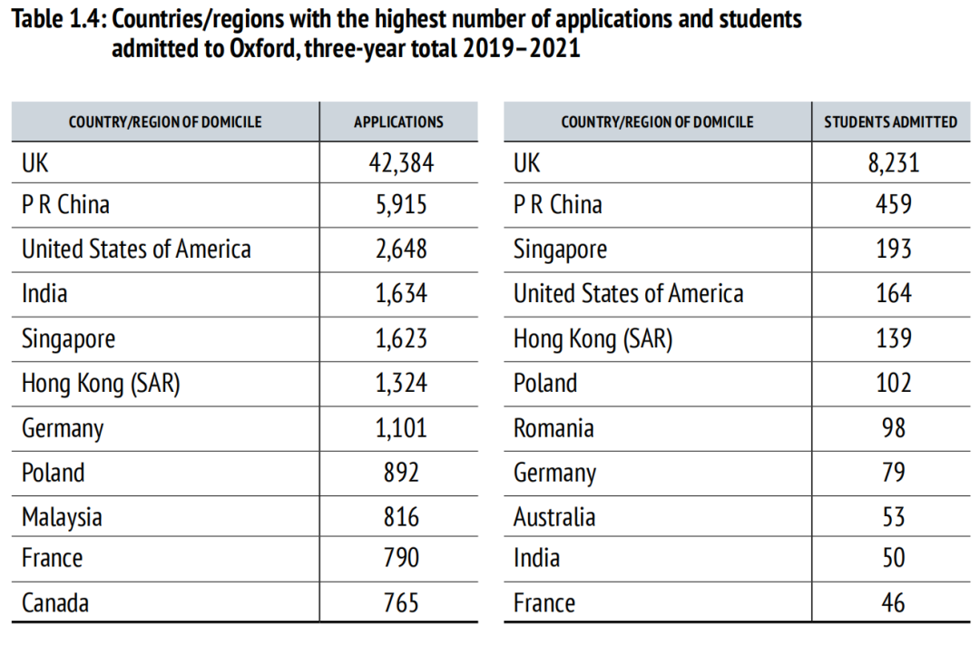 据牛津大学2019-21年招生报告数据显示,中国大陆学生向牛津递交的5915份申请,最终共459人被录取,录取率仅7.76%。