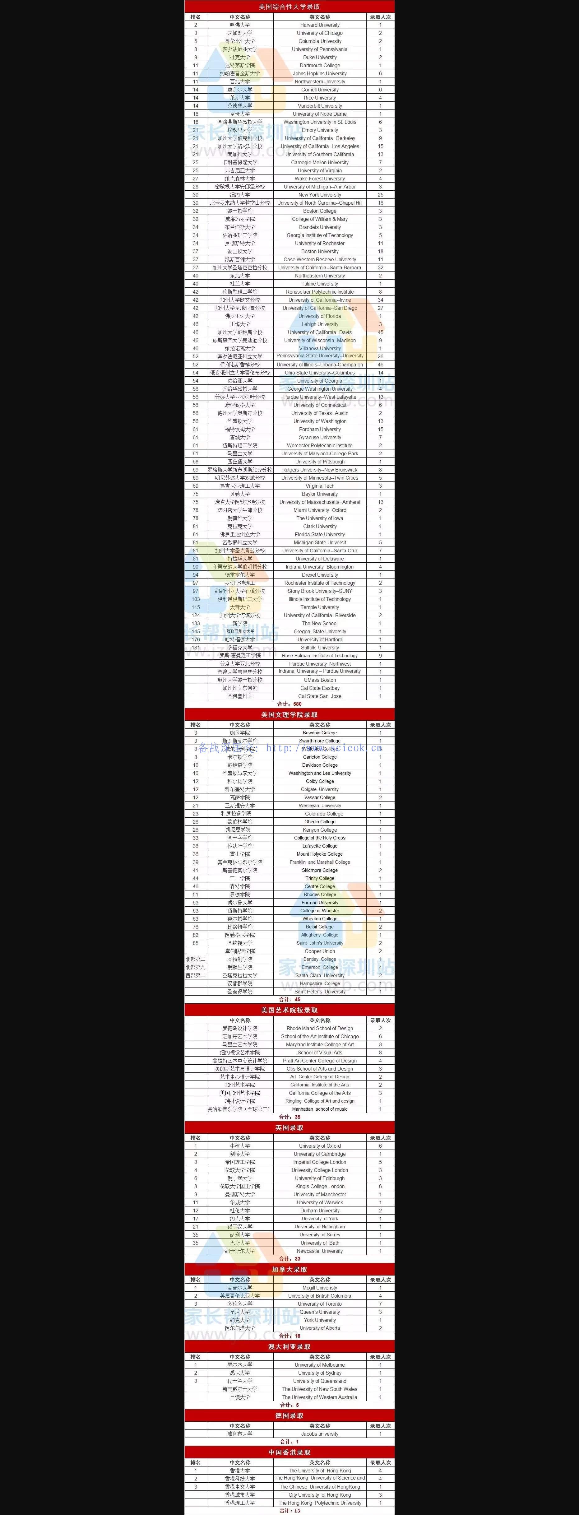 美国排名前20的综合性大学和文理学院总共录取了27名深中学子,发放了46份offer;美国排名前30的综合性大学和文理学院总共录取了88名深中学子,发放了144份offer;美国排名前50的综合性大学和文理学院总共录取了139名深中学子,发放了364份offer;共有14名学生收到罗德岛设计学院、曼哈顿音乐学院等11所美国顶尖艺术院校的35份offer。