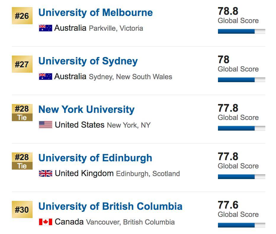 值得一提的是,本次排名中,爱丁堡大学和国王大学表现非常不错,分别排名为第28名和第37名。